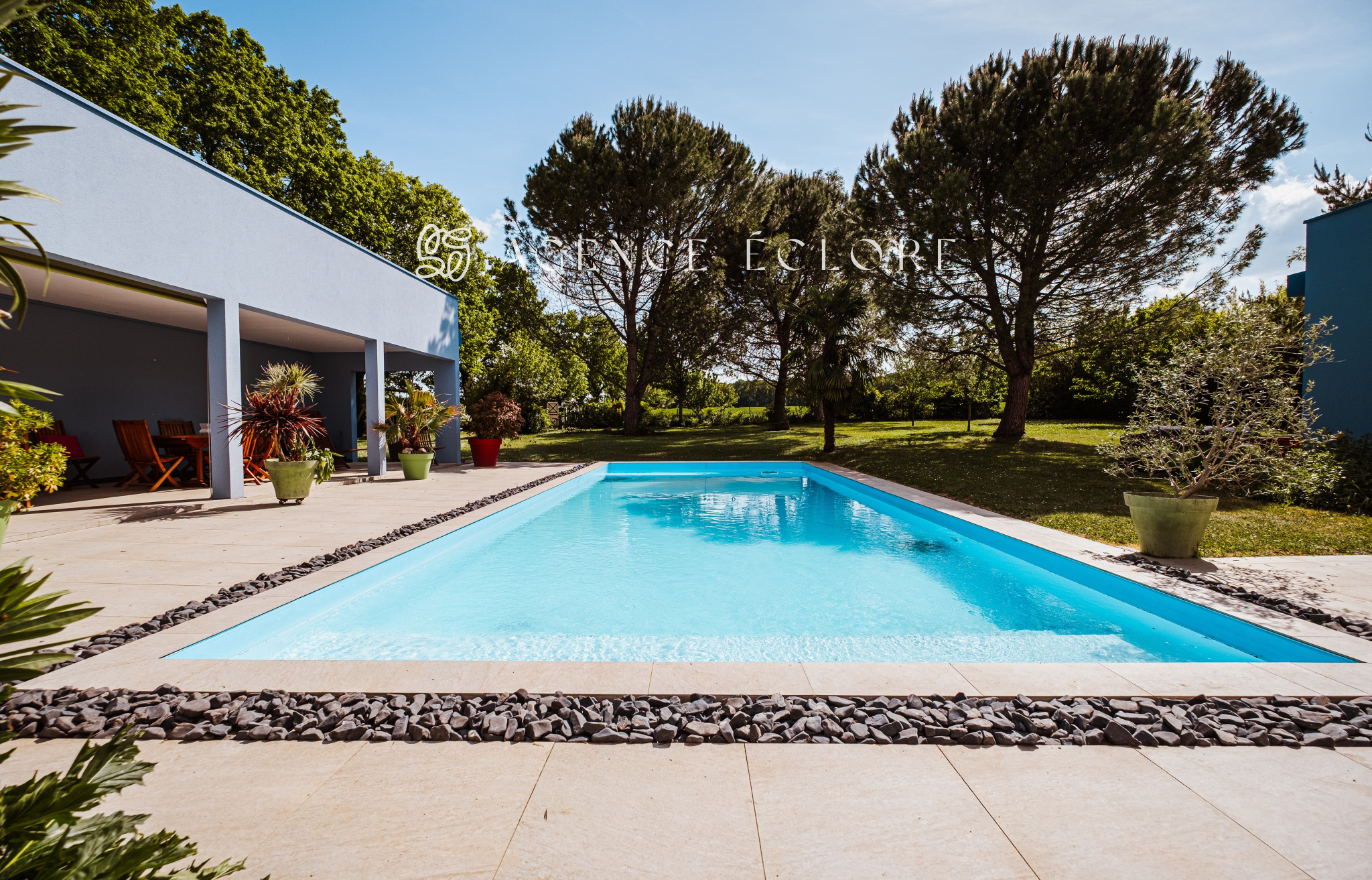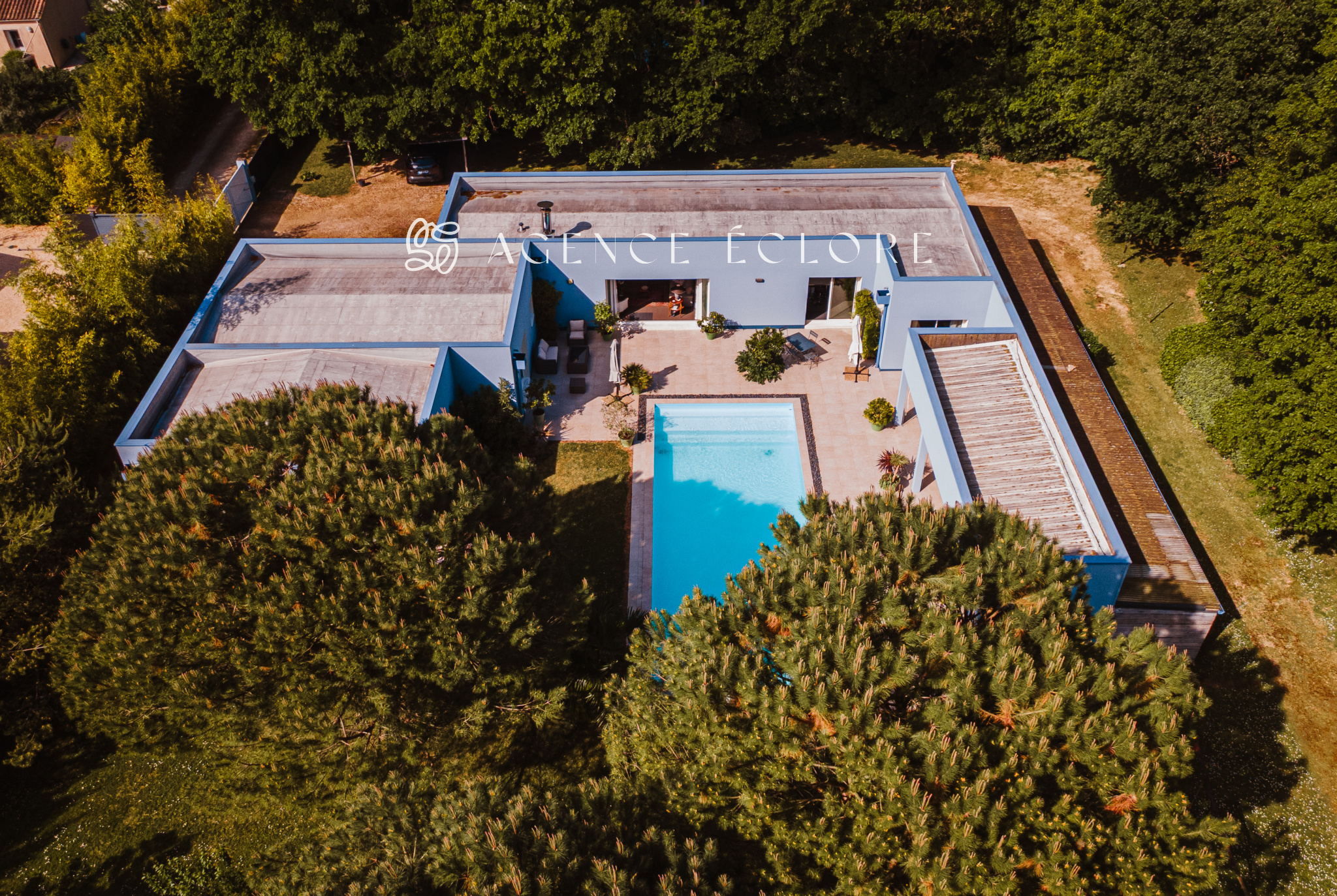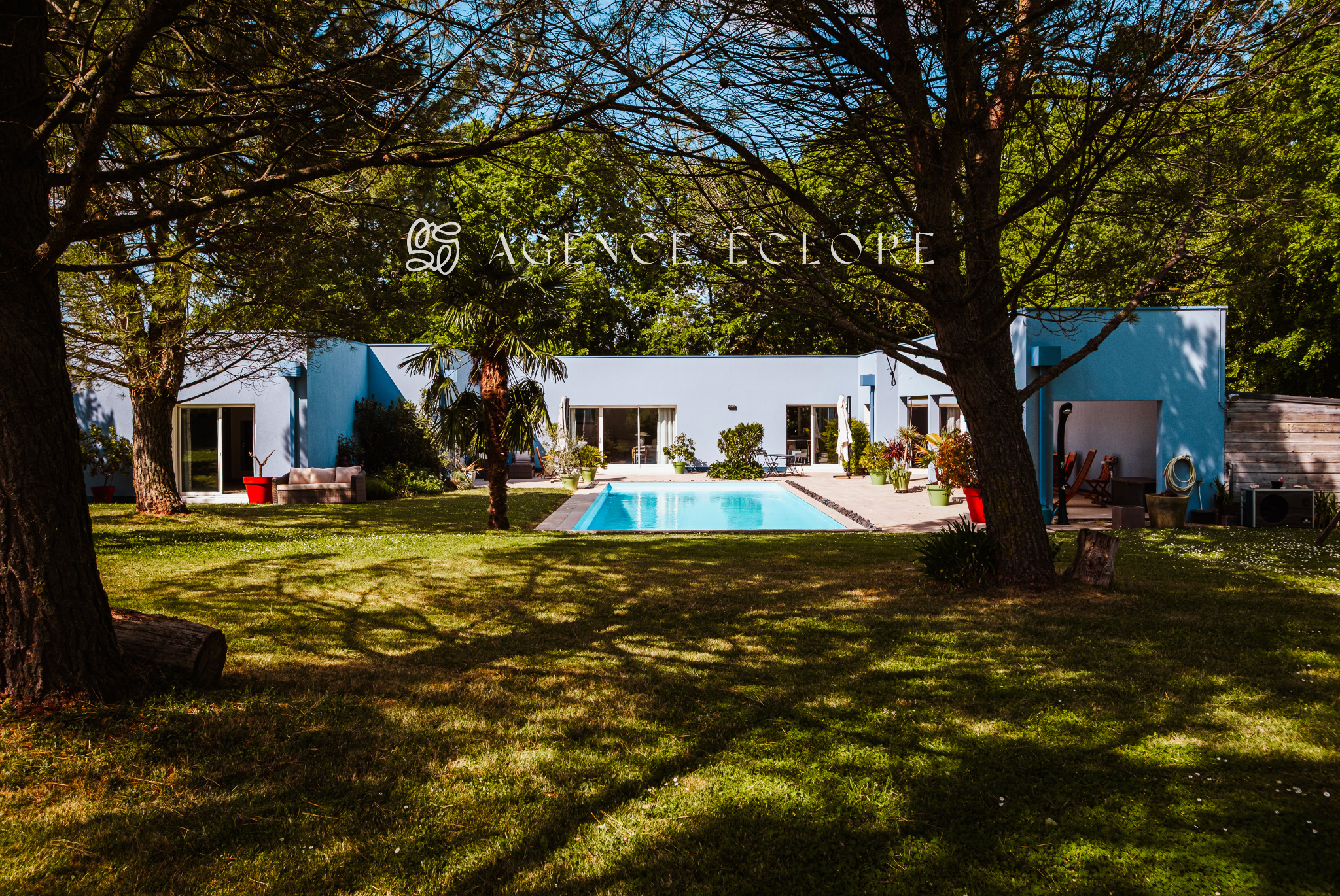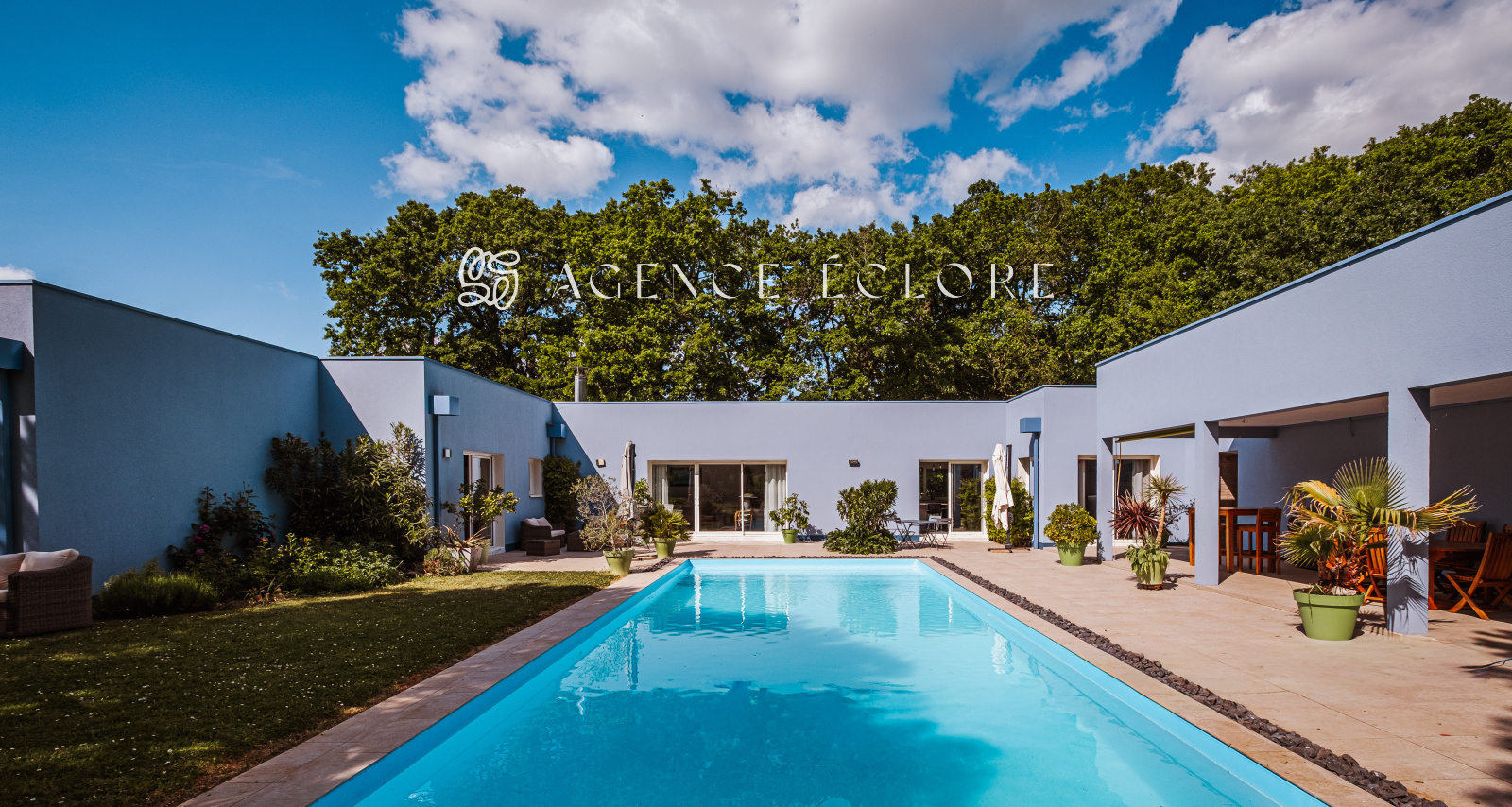 Conçue en U autour de la piscine centrale, l’ensemble des pièces dispose d’un accès au parc. Une large terrasse couverte promet de belles possibilités d’évolution et accueille une pièce de vie supplémentaire en saison, captant le soleil couchant.