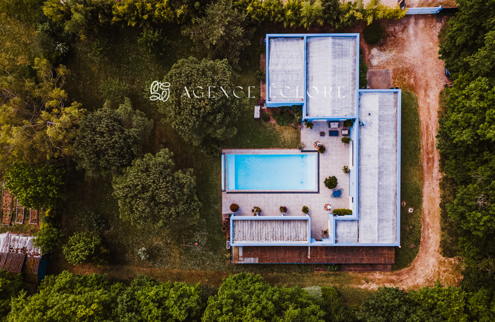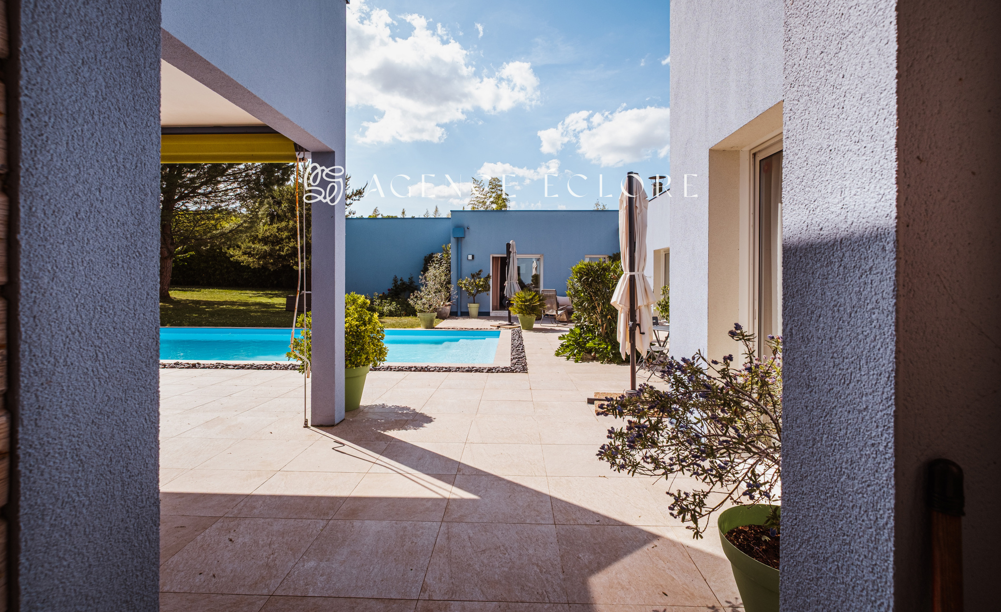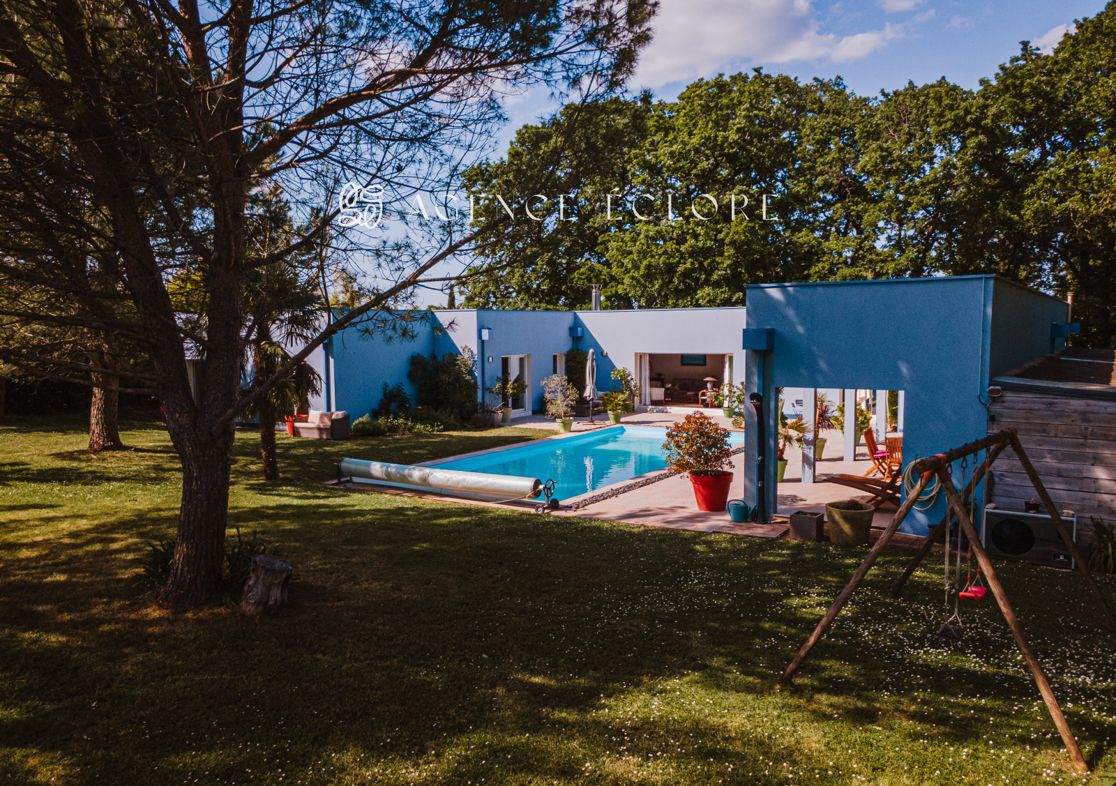 Conçue en U autour de la piscine centrale, l’ensemble des pièces dispose d’un accès au parc. Une large terrasse couverte promet de belles possibilités d’évolution et accueille une pièce de vie supplémentaire en saison, captant le soleil couchant.