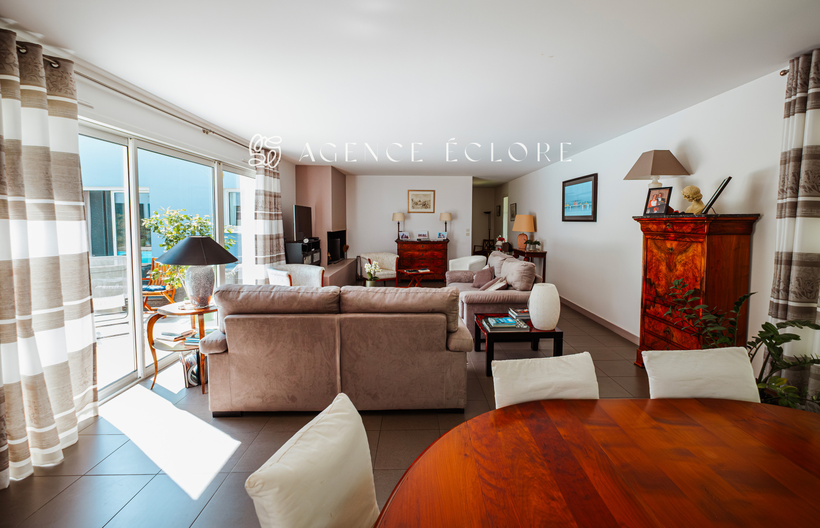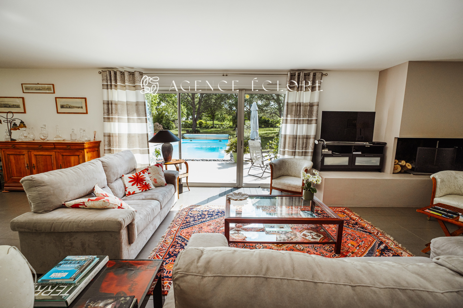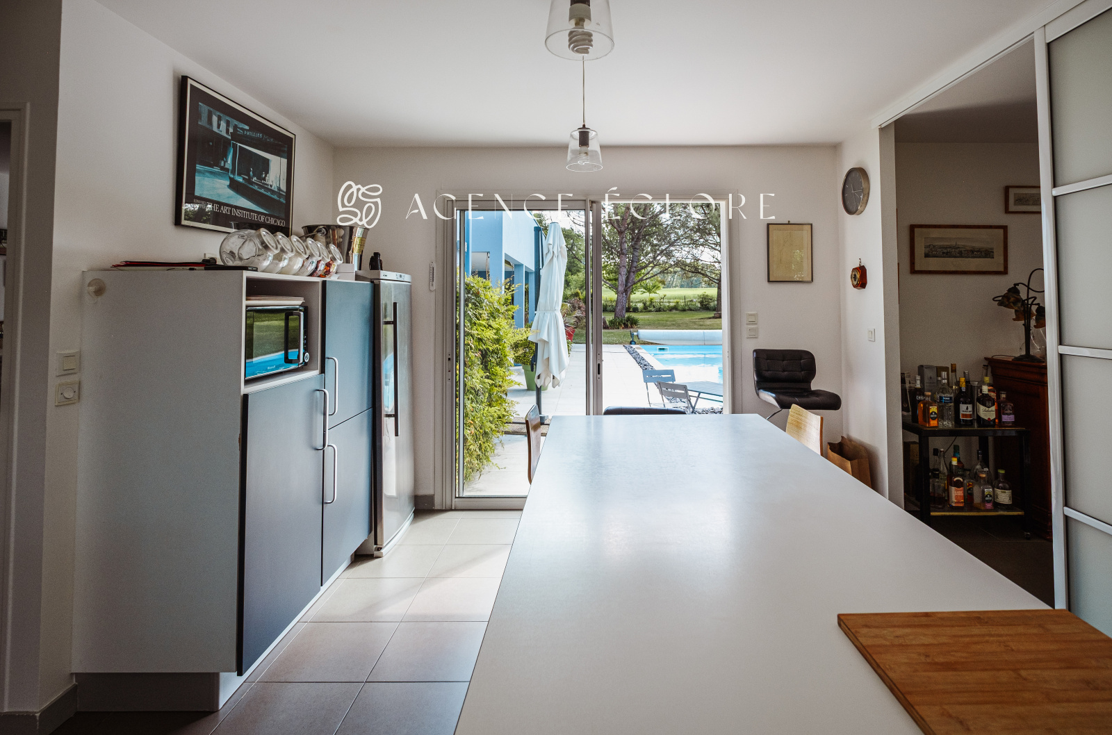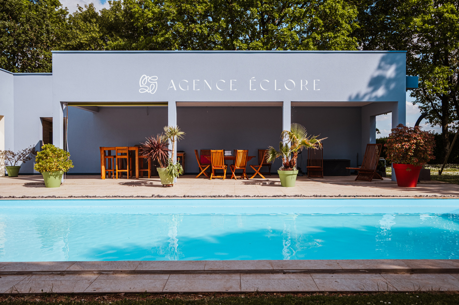 Conçue en U autour de la piscine centrale, l’ensemble des pièces dispose d’un accès au parc. Une large terrasse couverte promet de belles possibilités d’évolution et accueille une pièce de vie supplémentaire en saison, captant le soleil couchant.