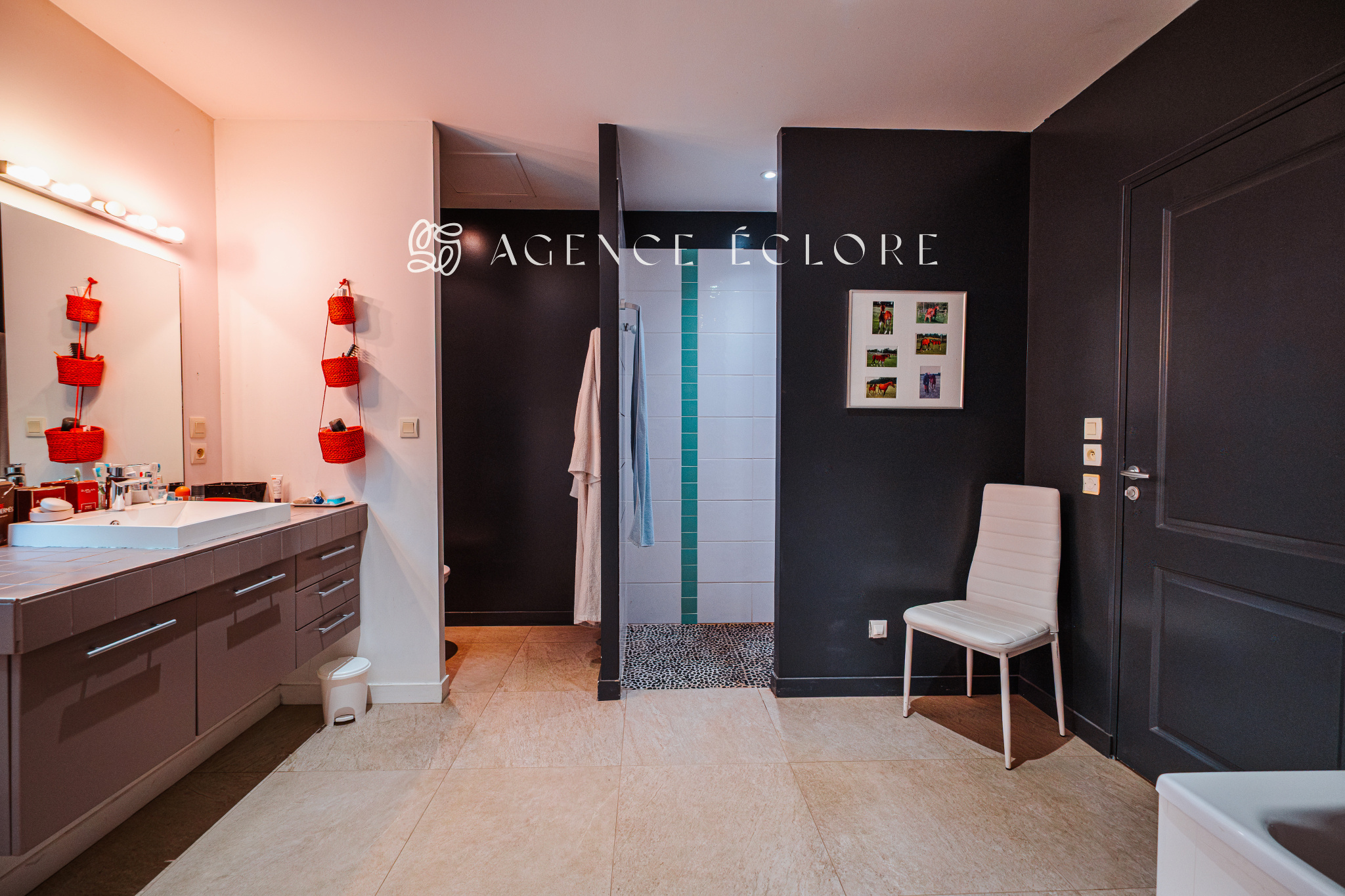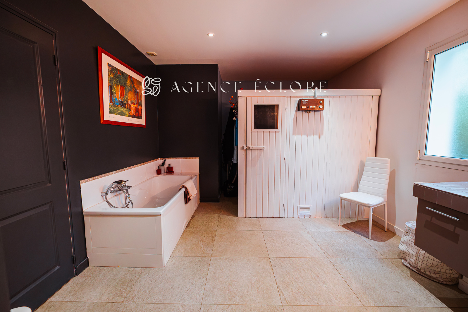 L’espace nuit possède une suite parentale de 28 m2 équipée de nombreux rangements et une salle d’eau avec douche à l’italienne, qui profite d’un ensoleillement du matin et d’une vue sur la piscine. Plus loin, deux autres chambres spacieuses profitent d’une grande salle de bains avec baignoire, douche à l’italienne et sauna.
